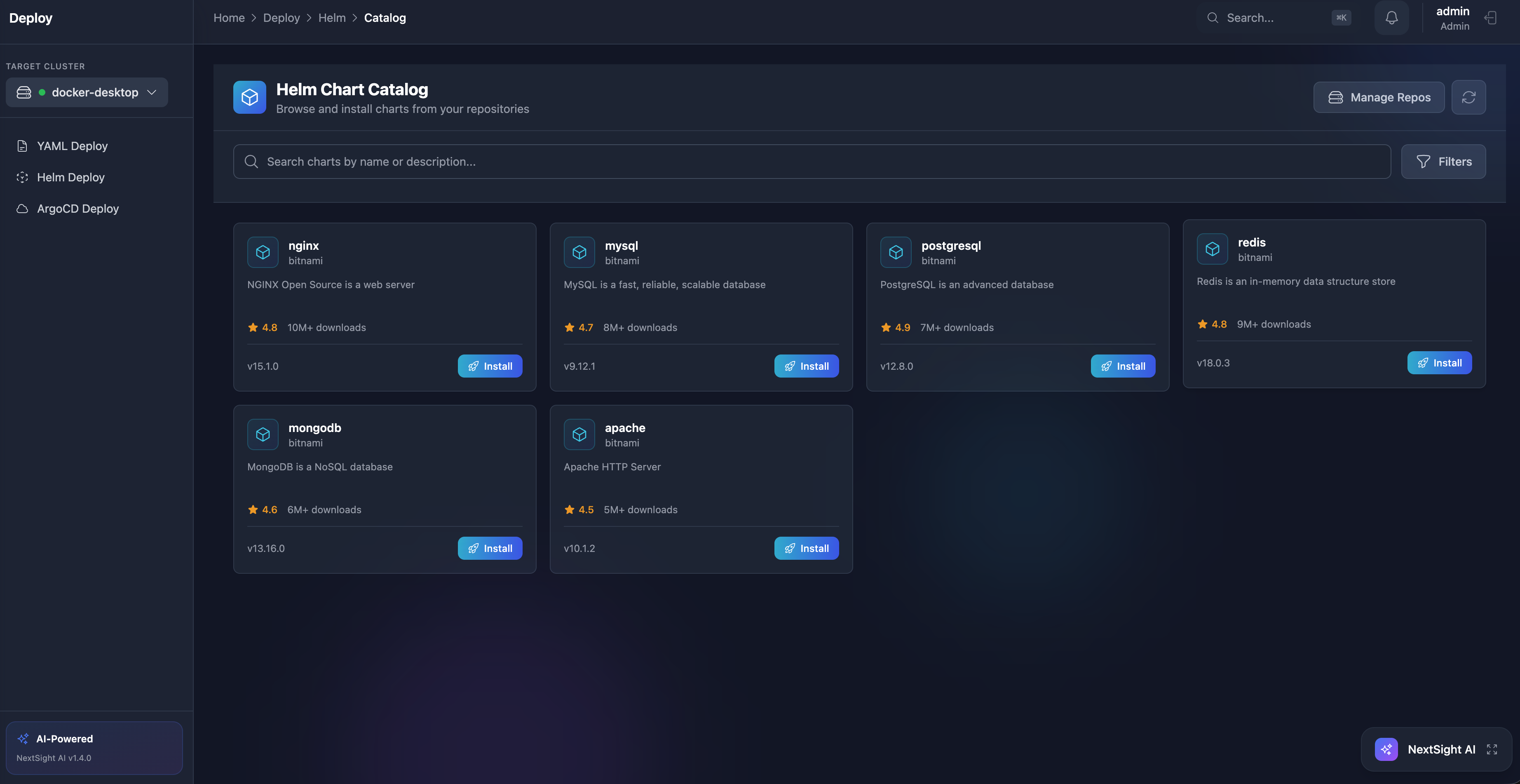 Visual Helm chart catalog with one-click deployment from any repository.