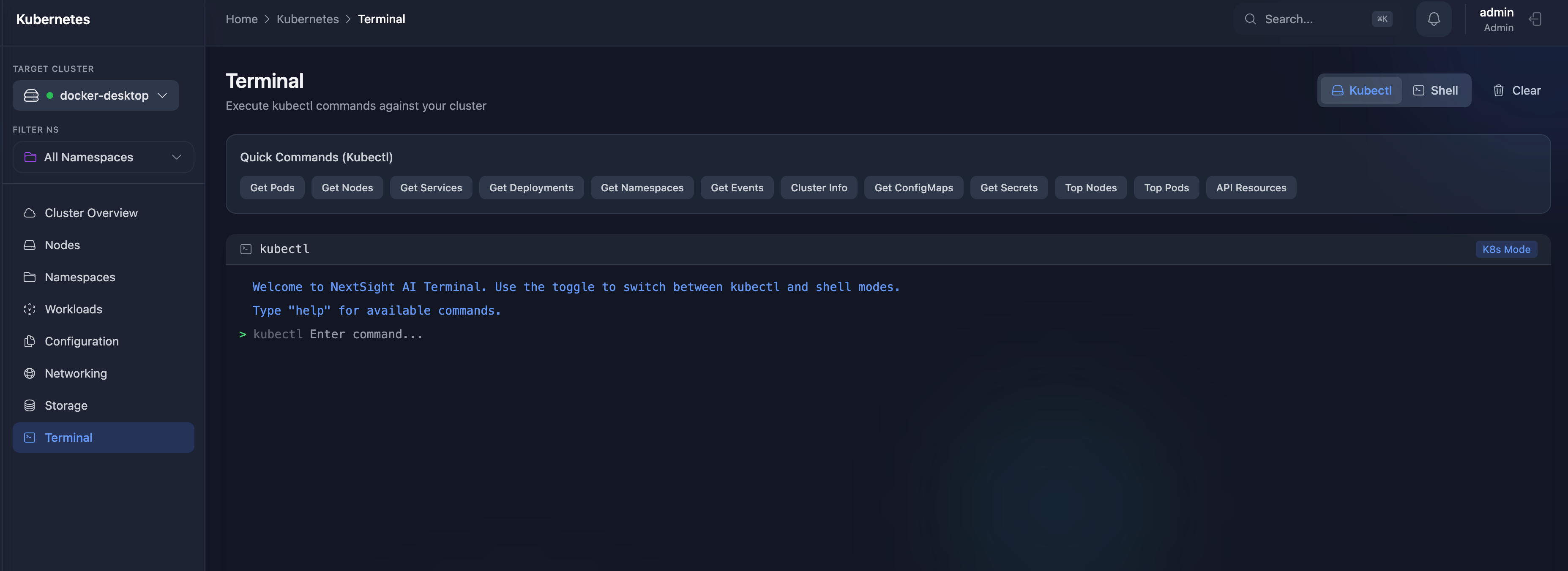 Full kubectl and shell access in your browser with xterm.js support.